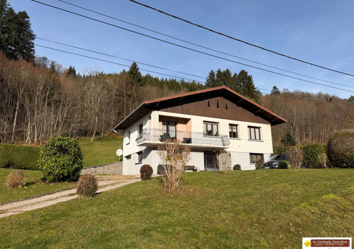 A l’étage, vous trouverez une cuisine équipée, un salon/séjour lumineux avec poêle à bois et accès au balcon, trois chambres, une salle d’eau et un WC séparé.