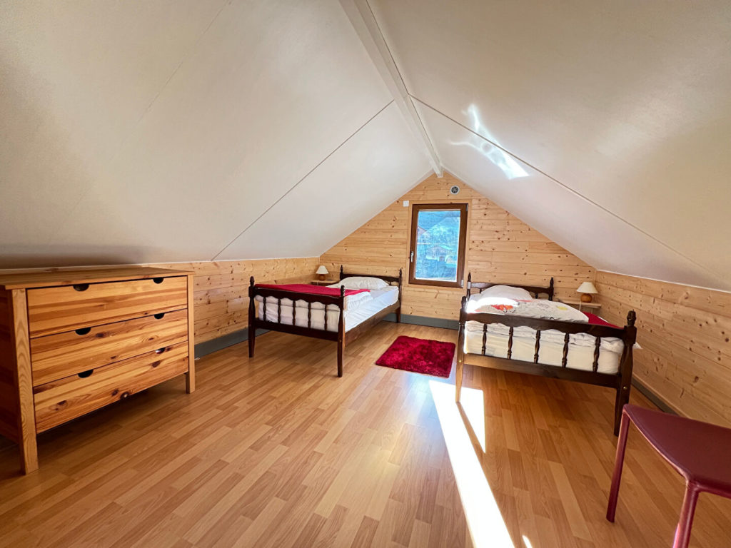 Il se compose d’un séjour chaleureux équipé d’un poêle à pellets, de deux chambres avec dressings, d’une cuisine fonctionnelle et d’une salle d’eau.